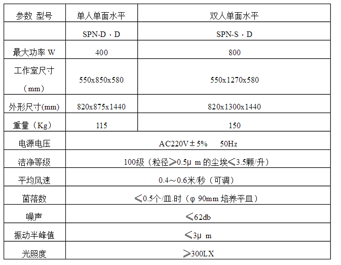 凈化工作臺(以下簡稱工作臺)是一種提供局部無塵、無菌工作環境的空氣凈化設備,對改善工藝條件和保證產品的高精度、高純度、高可靠性具有良好的效果。因此,廣泛應用于醫療衛生、制藥、生物、電子、G防、精密儀器儀表、化學實驗等行業。 二、 主要技術參數